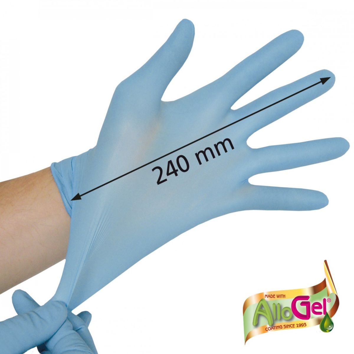 Одноразовые нитриловые перчатки голубого цвета, длина 240 мм, очень эластичные - сохраняют все тактильные ощущения.